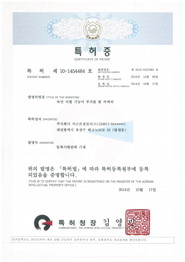 특허 제 10-1454464호 페이지 정보 작성자 최고관리자 작성일23-06-22 11:34 조회1,972회 댓글0건 본문 육안 식별 기능이 부가된 광 커넥터 댓글목록 이전글특허 제 10-1471066호 23.06.22 다음글특허 제 10-1379447호 23.06.22 검색 목록