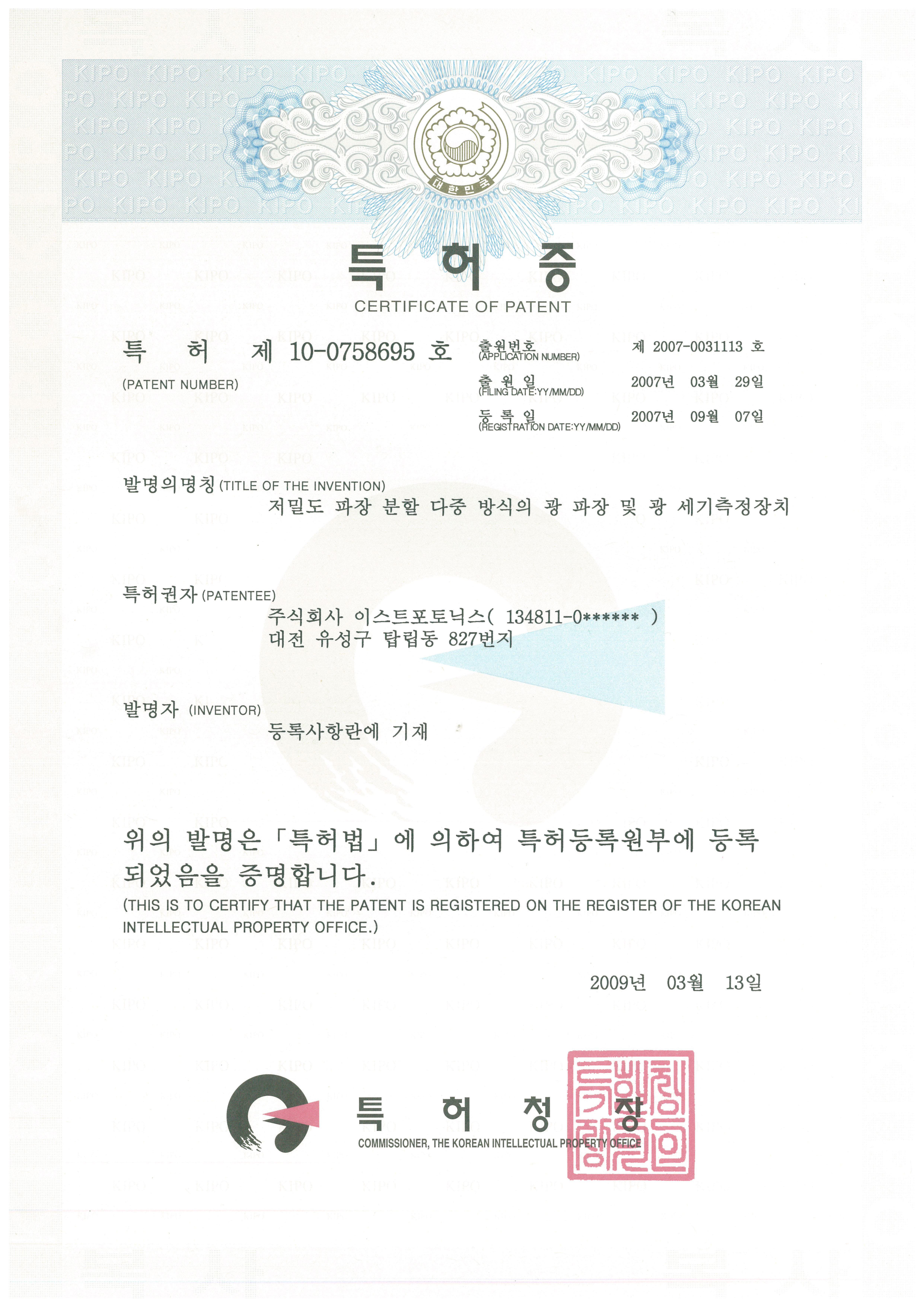 Patent No. 10-0758695