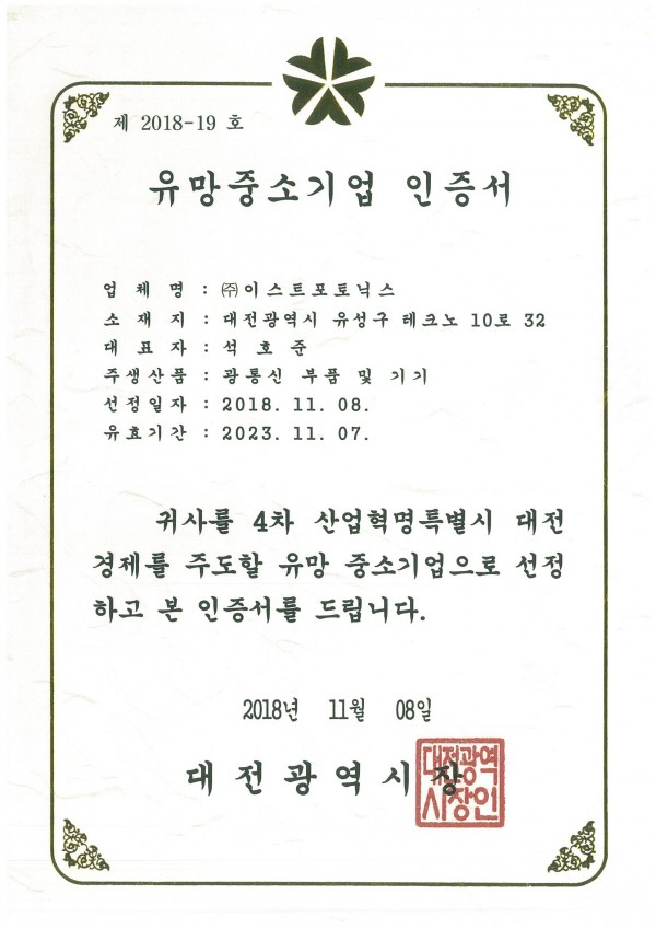 「有望中小企業」認証書 페이지 정보 작성자 최고관리자 작성일23-06-22 15:23 조회273회 댓글0건 본문 「有望中小企業」認証書 댓글목록 이전글「CLEAN事業場」認定書 23.06.22 다음글「部品素材専門企業」確認書 23.06.22 목록