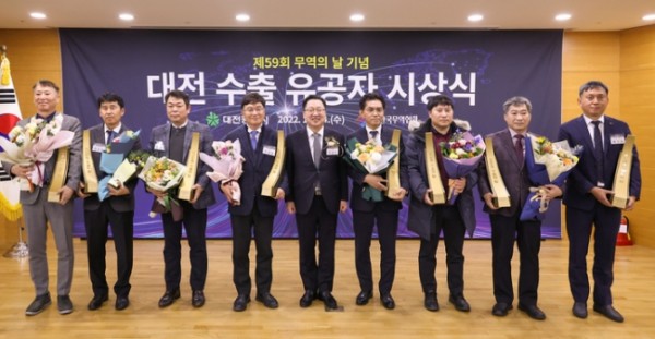 [Daejeon=Newsis] By Reporter Jo Myeong-hwi - Mayor Lee Jang-woo of Daejeon City attended the '59th Trade Day Commemoration Ceremony' held at Daejeon Trade Center on the 14th, receiving a government commendation and taking a commemorative photo. (Photo provided by Daejeon City)