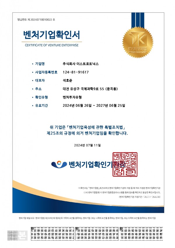 벤처기업확인서 페이지 정보 작성자 최고관리자 작성일23-06-22 15:21 조회2,117회 댓글0건 본문 벤처기업확인서 댓글목록 이전글유망중소기업 인증서 23.06.22 다음글무역협회 회원증 23.06.22 목록