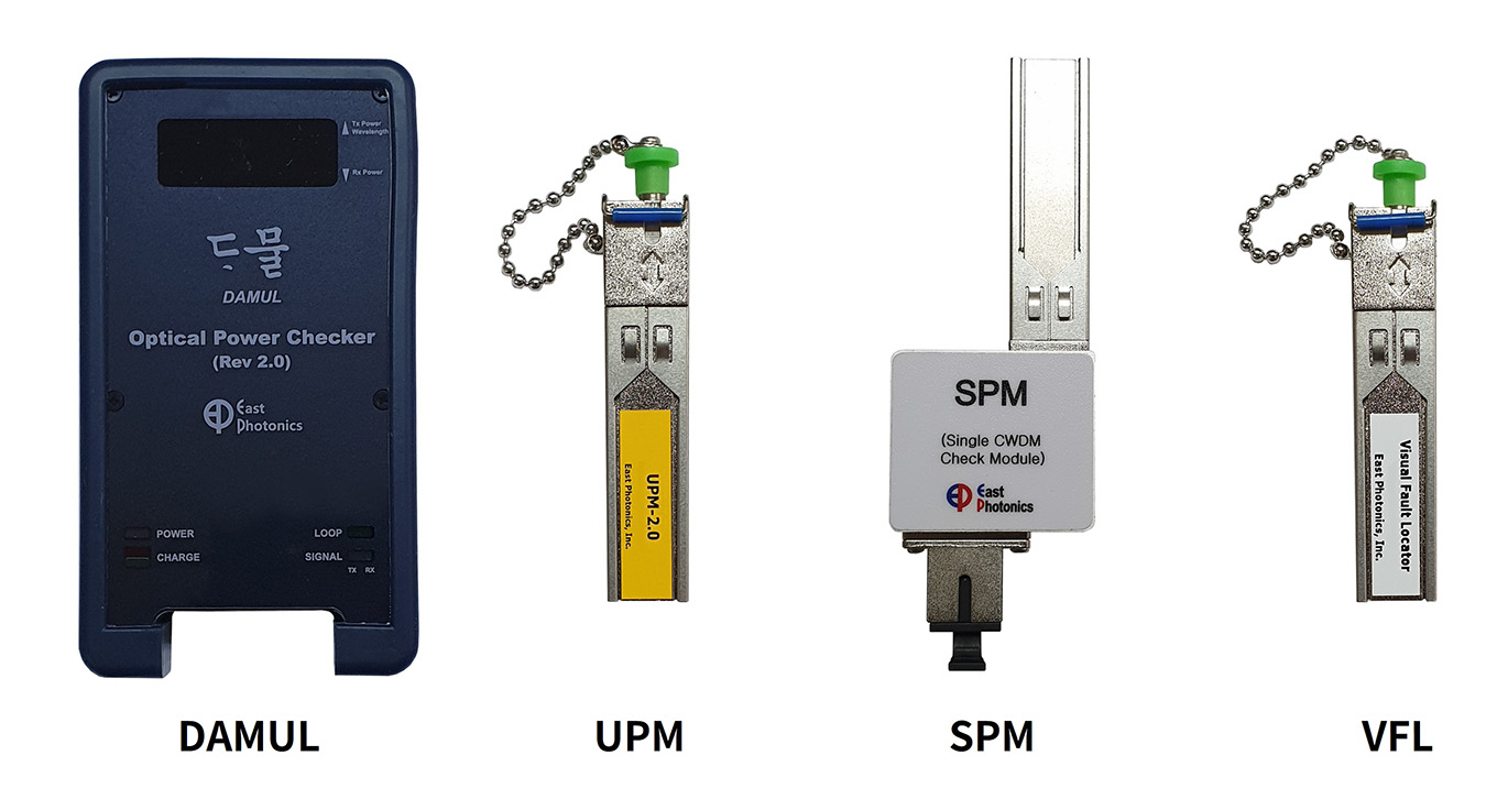 DAMUL is an innovative and portable optical power checker accompanying 1-core loop back function. DAMUL can check SFP TX and RX power level by simply inserting SFP into it. If you use UPM (Universal SFP-typed Power checker Module) optionally provided, DAMUL can measure optical power. Also, when using SPM (SFP-typed Power checker Module) optionally provided, DAMUL can identify 18 CWDM wavelengths as well as its power automatically. DAMUL provide users high productivity for optical power checking work on fiber optic systems such as WDM-PON.